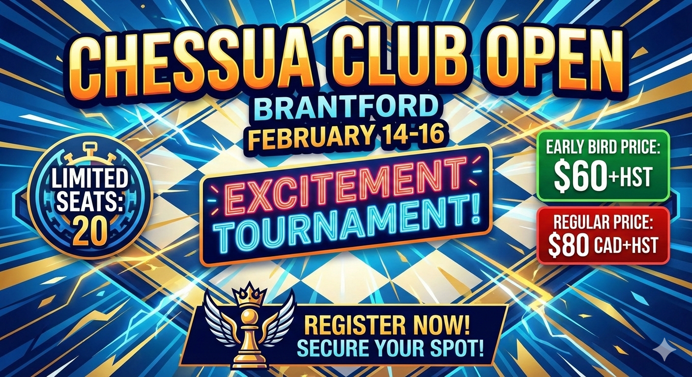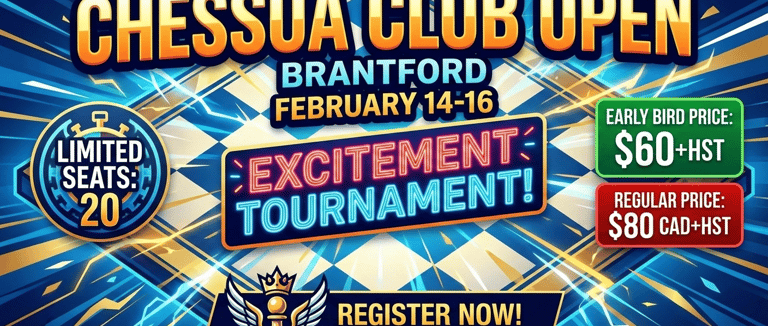 Hey, guys! Are you ready for a serious classical chess tournament in Brantford? It's a CFC-rated open tournament with a 60-minute time control plus 30 seconds per move. 6 Rounds in total. 3 days to enjoy the fight! Improve your chess tactics and positional understanding through long games! Our next open would be 90 minutes + 30 seconds per move. There are limited seats, so do not waste your time and book it today! More info here!
