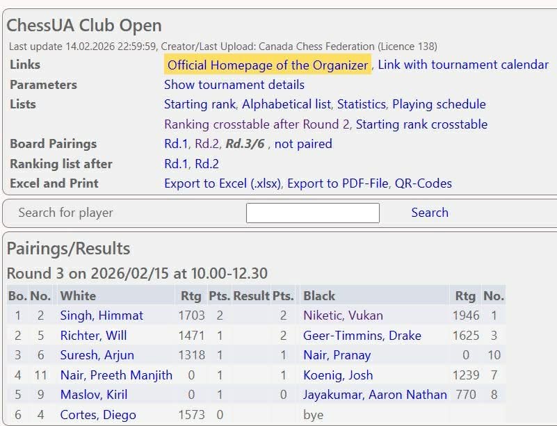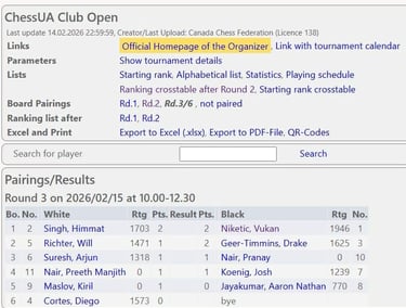 Hey, guys! Here are the results of the first day of ChessUA Club Open in Brantford! Pairings are ready as well. I will see you guys tomorrow (Sunday, Feb. 15) at 10 am.